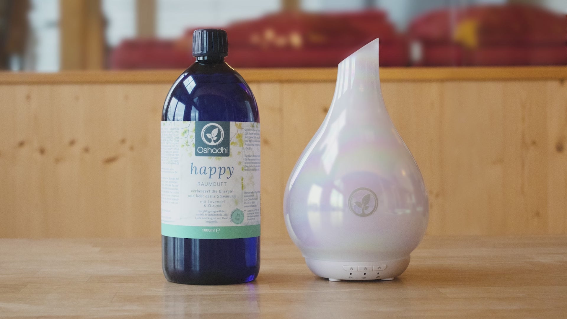 - 5-7 Tropfen eines ätherischen Öls oder einer Duftmischung in den Behälter geben. Alternativ können auch Hydrolate verwendet werden.