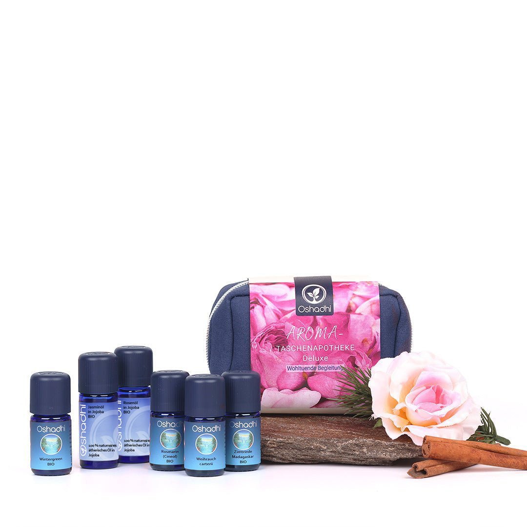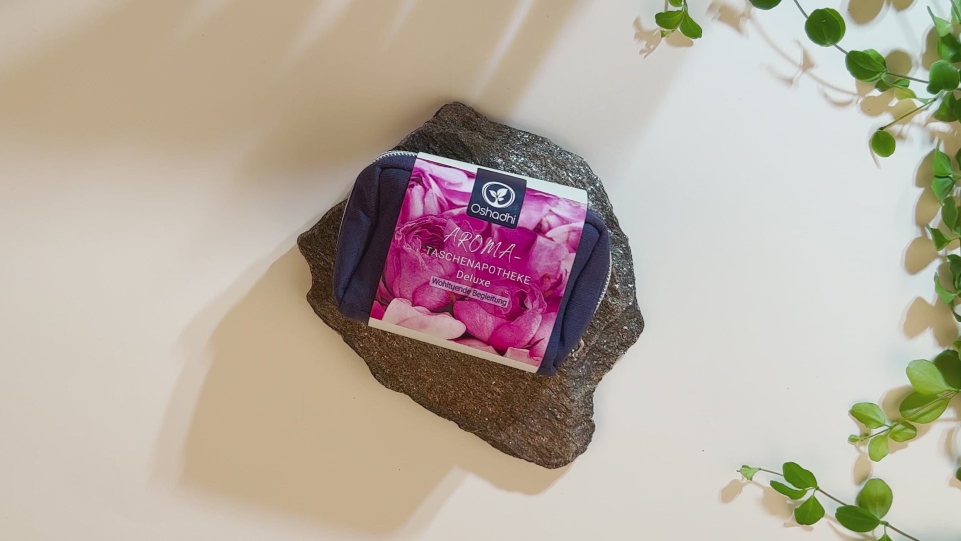 WOHLTUENDE BEGLEITUNG zuhause und unterwegs – die Oshadhi Taschenapotheke Deluxe mit 6 auserlesenen Essenzen schenkt dir angenehme Duftimpulse und sorgt für dein Wohlbefinden. Das Set hat ideale Handtaschengröße!