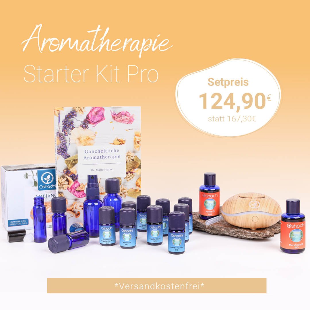 Aus diesem Grund haben wir das Aromatherapie Starter Kit Pro für dich zusammengestellt. Es umfasst 10 ätherische Öle für alle Fälle, 2 Basisöle, Dr. Malte Hozzels Buch "Ganzheitliche Aromatherapie", den Ambiance Aroma Diffuser, sowie leere Flaschen und eine Pipette zum Selbstmischen.