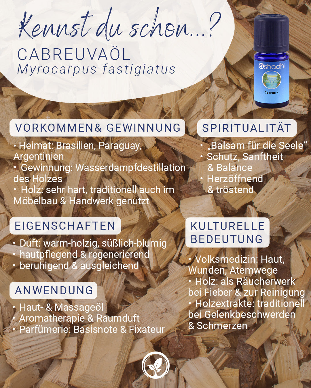 Hole dir mit Cabreuvaöl einen besonderen Begleiter für deine natürliche Aromapflege. Ob in der Hautpflege, für die Raumbeduftung oder als feine Basisnote in der Parfümerie – dieses Öl bringt Wärme, Harmonie und seelische Ausgeglichenheit in deinen Alltag.