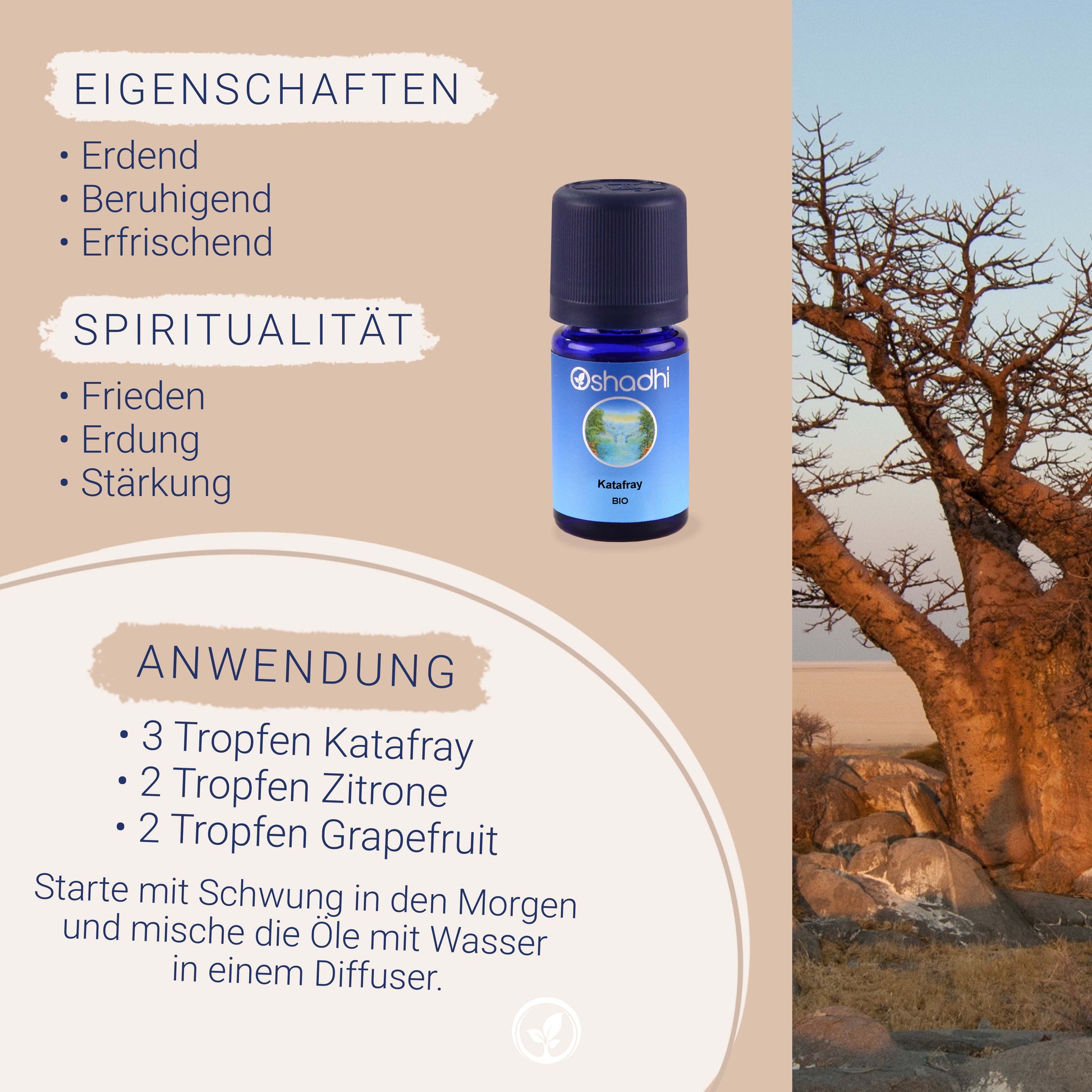 Das ätherische Katafray-Öl entfaltet seine Kraft auf mehreren Ebenen: Es beruhigt den Geist, löst Spannungen m Körper und fördert ein Gefühl von Erdung und Klarheit. Besonders in stressigen Zeiten oder nach körperlicher Anstrengung kann es harmonisierend und revitalisierend wirken.