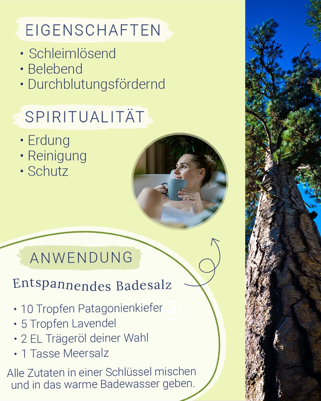 Kiefernöl (Patagonienkiefer) ist ein vielseitiges ätherisches Öl, das auf unterschiedliche Weise genutzt werden kann.