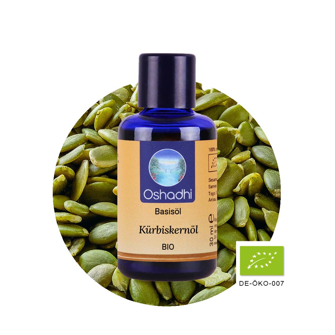 Aus den Kürbissamen wird mittels Kaltpressung ein dunkelgrünes, stark nussig duftendes Basisöl gewonnen.