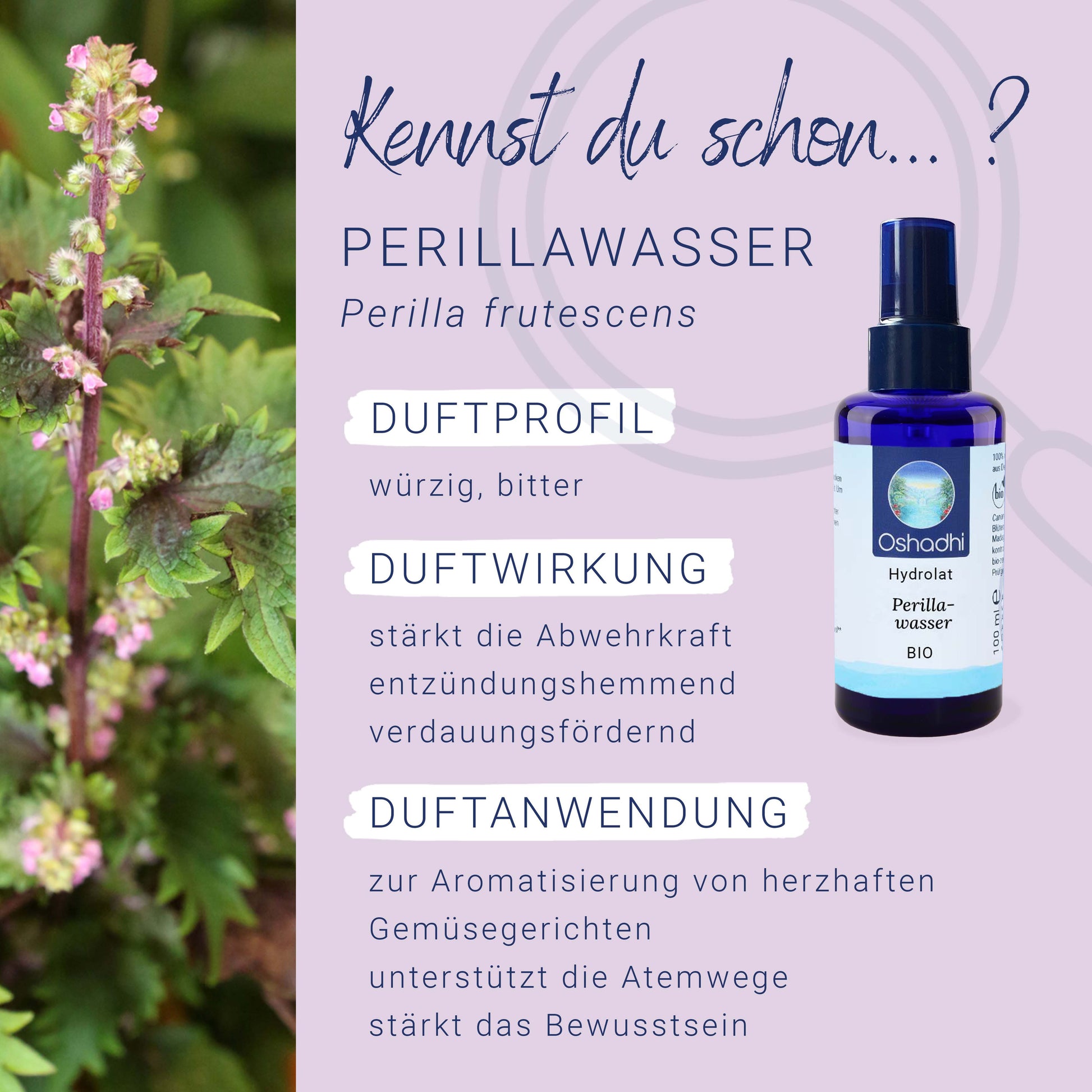 Die Perilla gehört zu der Gattung der Lippenblütler und ist in Ostasien beheimatet. Die Pflanze gedeiht besonders in sonnigen oder halbschattigen Lagen und wird zwischen 30 und 60cm groß. Ihre Blätter sind oval, rau und zottig behaart. Aus den Samen gewinnt man das Omega Fettsäuren-reiche Pflanzenöl. Aus den Blättern werden das ätherische Öl und das stark würzig duftende Pflanzenwasser gewonnen.