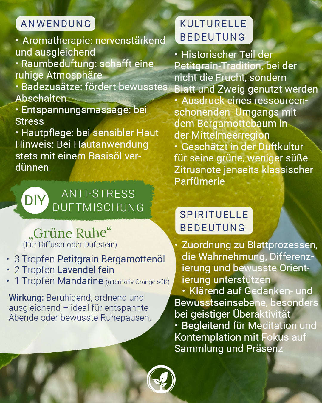 Das ätherische Petitgrain-Bergamotte-Öl wirkt besonders auf die emotionale Balance: Es beruhigt bei innerer Unruhe und Stress, hebt die Stimmung und schenkt neue Leichtigkeit. Gleichzeitig unterstützt es einen erholsamen Schlaf, ist hautfreundlich und wirkt sanft klärend.