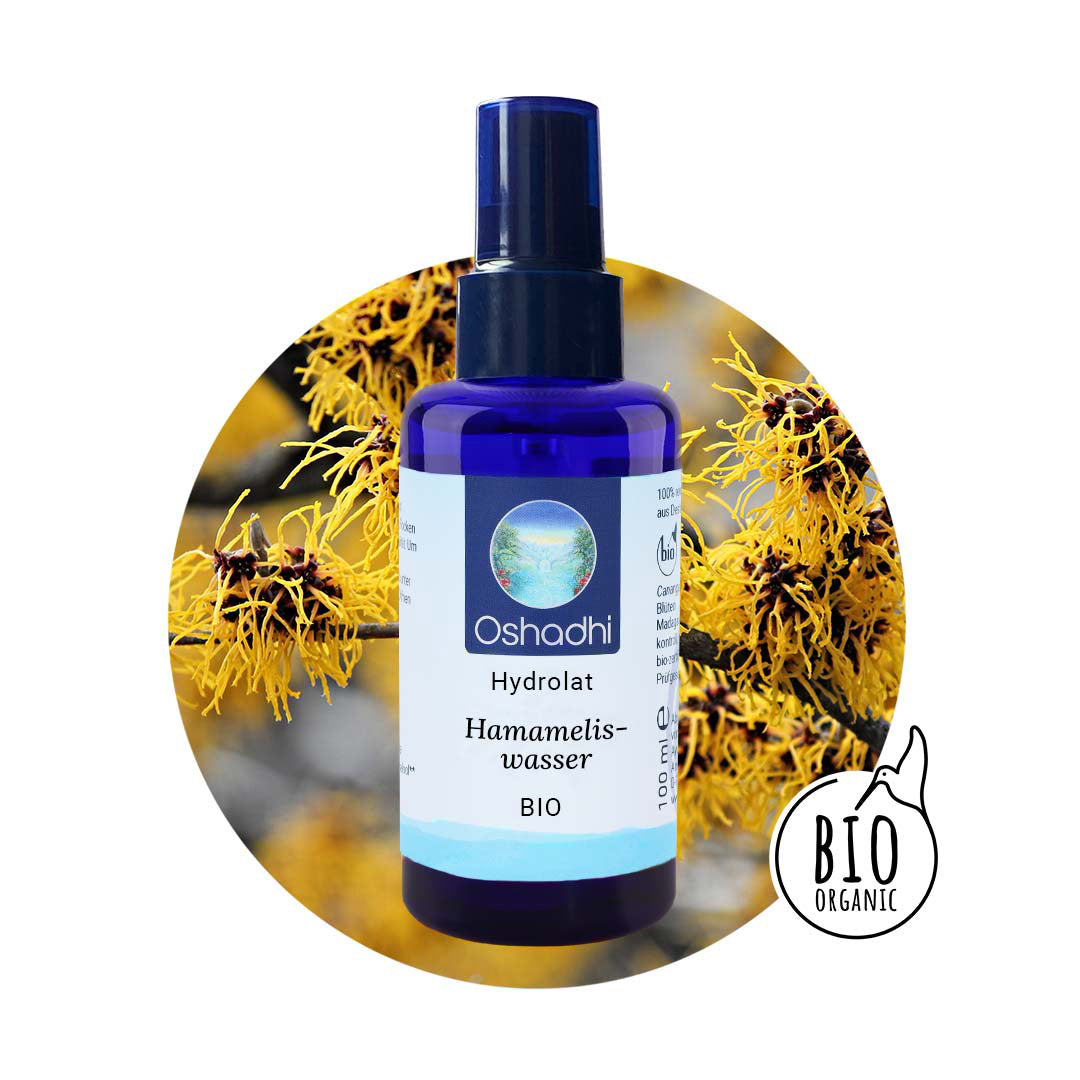 Hamamelis ist eine Pflanzengattung innerhalb der Familie der Zaubernussgewächse. Hamamelis-Arten wachsen als sommergrüne Sträucher und kleine Bäume. Sie kommen im östlichen Nordamerika und östlichen Asien vor. Der angenehme Duft der Blüten wird als herb-krautig bezeichnet. Hamamelis-Blätter enthalten vor allem kondensierte Gerbstoffe. Weitere Inhaltsstoffe der Zaubernuss sind verschiedene flüchtige Verbindungen wie Alkane, aliphatische Alkohole und Aldehyde. Wegen dieser Inhaltsstoffe, die zusammenziehende Eigenschaften besitzen sollen, wird die Pflanze gerne für die Hautpflege verwendet- insbesondere bei der Behandlung von grobporiger und fettiger Haut.