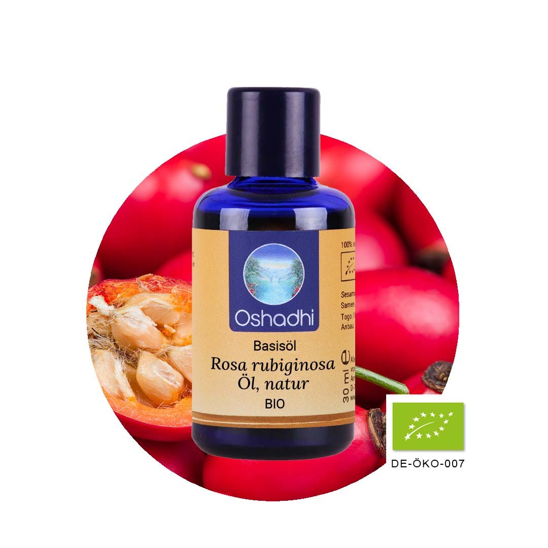 Das Rosa Rubiginosaöl weißt einen hohen Gehalt der Alpha-Linolensäure auf und ist reich an Carotinoiden und der Trans-Retinolsäure. Die Kombination dieser Inhaltsstoffe aktiviert die Zellerneuerung und die Kollagensynthese, schützt vor freien Radikalen und kann die Narbenheilung fördern.