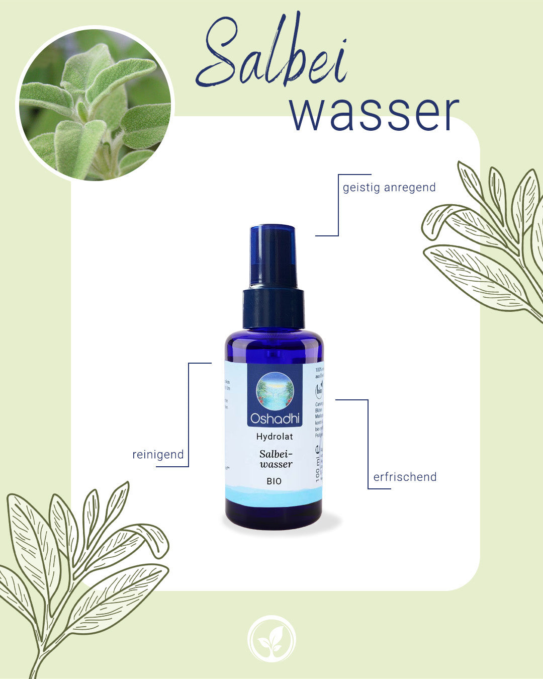 - Als Bio-Rohstoff zur Herstellung von Kosmetika: klärendes Gesichtswasser, Haarwasser bei fettiger Kopfhaut oder mildes Deodorant – Bio-Salbeiwasser wirkt erfrischend und adstringierend