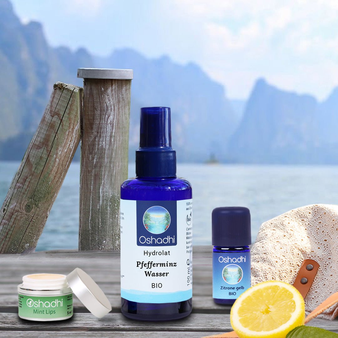 NATÜRLICHE ERFRISCHUNG – mit den steigenden Sommertemperaturen sehnen wir uns nach einer Erholung im kühlen Nass. Keine Zeit zum Baden gehen? Das Oshadhi Sommerset bringt dir Erfrischung: Mit spritzigem Zitrusöl, vitalisierendem Pfefferminzwasser und dem geschmeidigen Lippenbalsam Minze – egal ob du gerade zuhause, unterwegs oder an deinem Arbeitsplatz bist. Gemeinsam schenken sie dir neue Energie, Vitalität und Abkühlung.