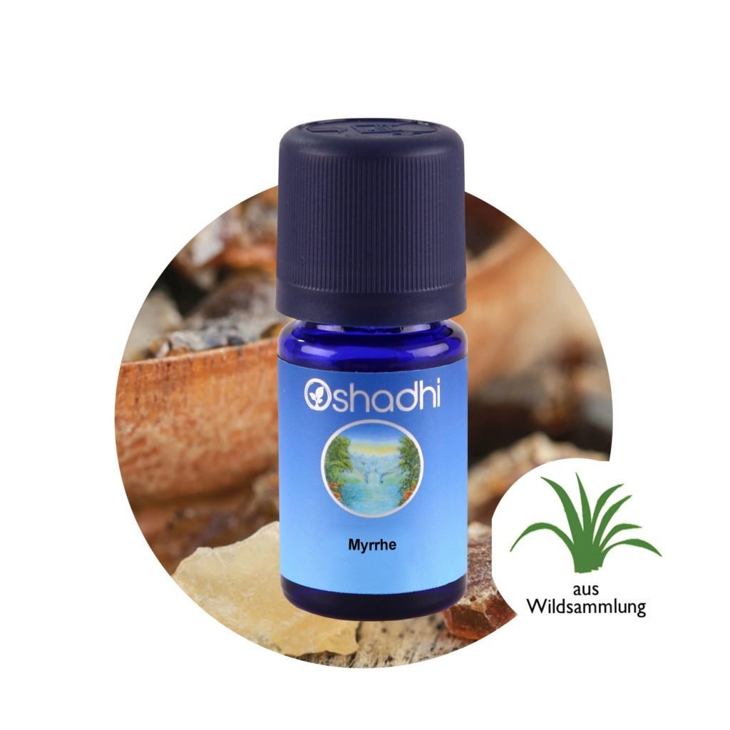 Myrrhe ist das aromatische Harz eines bis zu drei Meter hohen, dornigen Strauches, der zur Familie der Balsamgewächse gehört. Diese wachsen in Somalia und in Südarabien. Die Anwendung der Myrrhe lässt sich bis zur Pharaonenzeit zurückverfolgen. Sie gehört unter anderem zu den heiligen Salbölen des Altertums. Griechische Soldaten wussten schon im Altertum um die Kraft der Myrrhe, indem sie duftende Kügelchen des Harzes in ihrer Kampfausrüstung stets mit sich trugen. Der hohe Anteil an Furanoeudesma-1,3-diene ist für eine stark schmerzstillende Wirkung bekannt. Im Ayurveda wird die Myrrhe für die Herstellung von Rasayanas (natürliche Rezepte für die Forderung von optimaler Gesundheit) benutzt. Aromatherapeuten kombinieren Myrrhe gerne mit dem ätherischen Weihrauch Öl. Der Duft zentriert und beruhigt die Gedanken und lässt gelassen in die Zukunft blicken. Die Hauptinhaltsstoffe der Myrrhe sind die Sesquiterpene, deren Eigenschaften als sehr hautfreundlich und seelisch stark stabilisierend beschrieben werden. Man geht davon aus, dass sie die Histaminproduktion regulieren und damit auch schmerz- und entzündungshemmend wirken. In Erkältungsmischungen entfaltet das Myrrhenöl seine entzündungshemmenden, antiviralen und schleimlösenden Eigenschaften. Seit altersher wird sie als Schönheitsmittel für die Haut eingesetzt und ist für alle Hauttypen geeignet, gerade wenn diese stark strapaziert oder irritiert ist. Auch zur Fußpflege ist sie geeignet. Da sie stark regenerierend wirkt, kann sie auch bei kleineren Hautverletzungen benutzt werden. (Quelle: satureja.com)